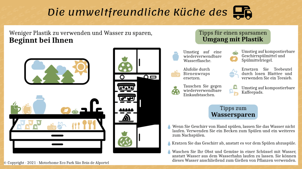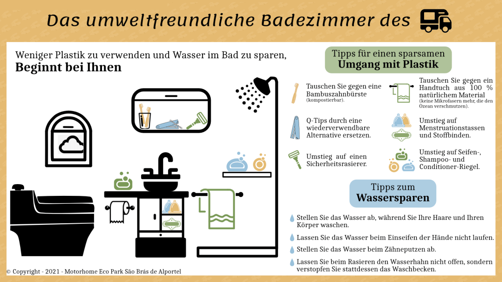 Die folgenden Tipps konzentrieren sich auf die Reduzierung des Verbrauchs von Produkten auf Plastikbasis und auf das Sparen von Trinkwasser im Bad und in der Küche eines Wohnmobils.