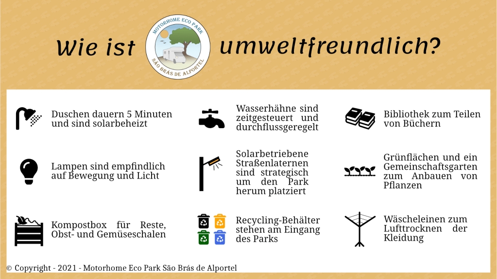 Recycling wird von Land zu Land unterschiedlich gehandhabt und es ist sehr wichtig zu wissen, wie man es richtig macht. Hier in Portugal gibt es Wertstofftonnen in drei Farben: Gelb für Plastik, Blau für Papier und Grün für Glas. In unserem Park haben wir außerdem zwei weitere Behälter: braun für Kompost und schwarz für den restlichen Müll. Auf dem Bild unten sehen Sie einige Beispiele, wie Sie Ihren Müll richtig trennen können.