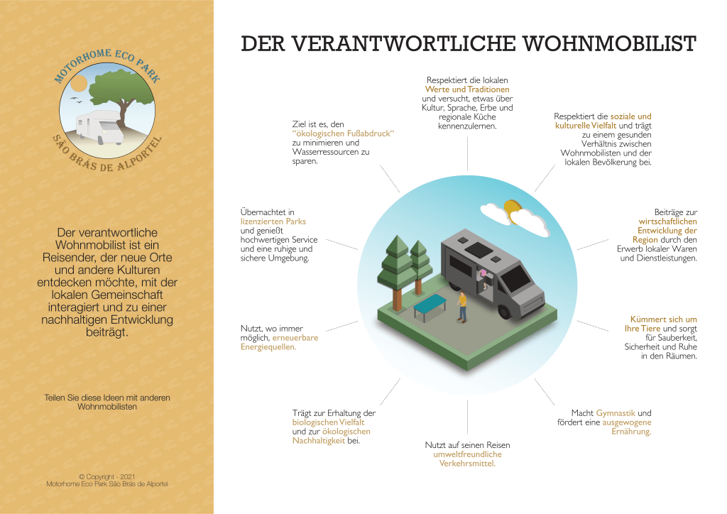 Reisen in einem Wohnmobil ist eine Idee, über die die meisten Menschen nachgedacht haben. Da es Ihnen ermöglicht, Abenteuer zu erleben und neue Orte zu erkunden, während Sie gleichzeitig die Sicherheit und den Komfort der Reisenden gewährleisten. Ein Motorhomer zu sein bedeutet jedoch, dass Sie gegenüber den Menschen, den Orten und der Umwelt um Sie herum verantwortlich und respektvoll sein müssen. Im folgenden Bild haben wir die wichtigsten Aspekte eines verantwortungsbewussten Motorhomers zusammengefasst.